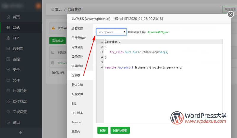 如果你在WordPress后臺(tái)設(shè)置了固定鏈接,在前臺(tái)訪問的時(shí)候出現(xiàn)404錯(cuò)誤,說明沒有偽靜態(tài)規(guī)則,你可以在寶塔面板,對(duì)應(yīng)的站點(diǎn)設(shè)置下,找到偽靜態(tài),直接選擇wordpress,保存即可: