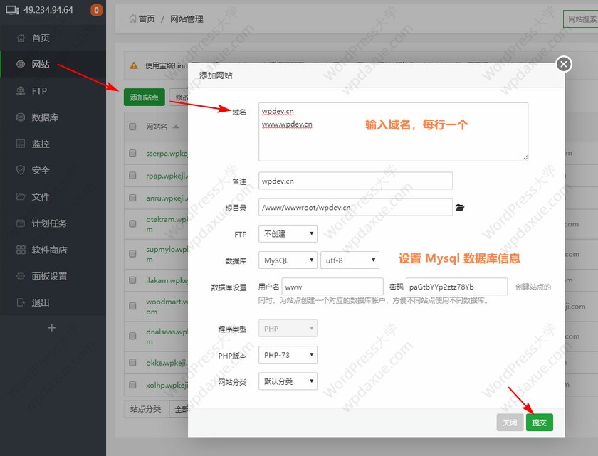 在寶塔后臺(tái),通過 網(wǎng)站 – 添加站點(diǎn),就可以彈出下圖界面,按照下圖提示即可:
