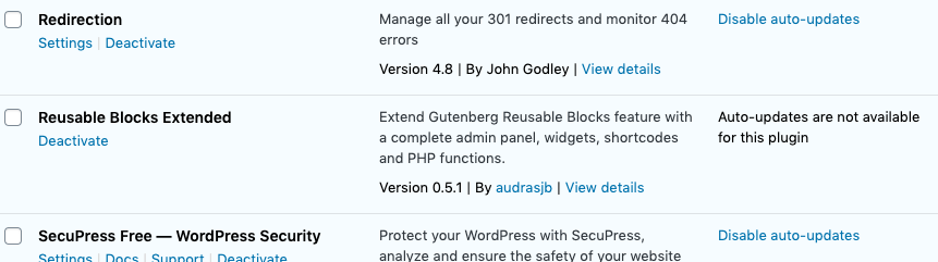 默認(rèn)情況下,所有具有update_plugins和update_themes功能的用戶都可以分別切換插件和主題的自動(dòng)更新。在多站點(diǎn)安裝中,只有網(wǎng)絡(luò)管理員才具有此功能,并且僅在網(wǎng)絡(luò)儀表板的上下文中才具有。