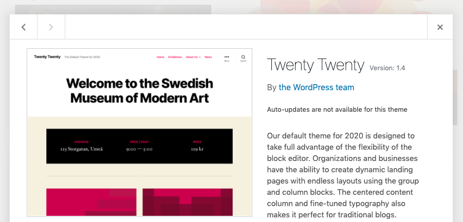 有關(guān)主題data對(duì)象可用屬性的完整文檔,請(qǐng)參見wp_prepare_themes_for_js() DevHub頁(yè)面。
