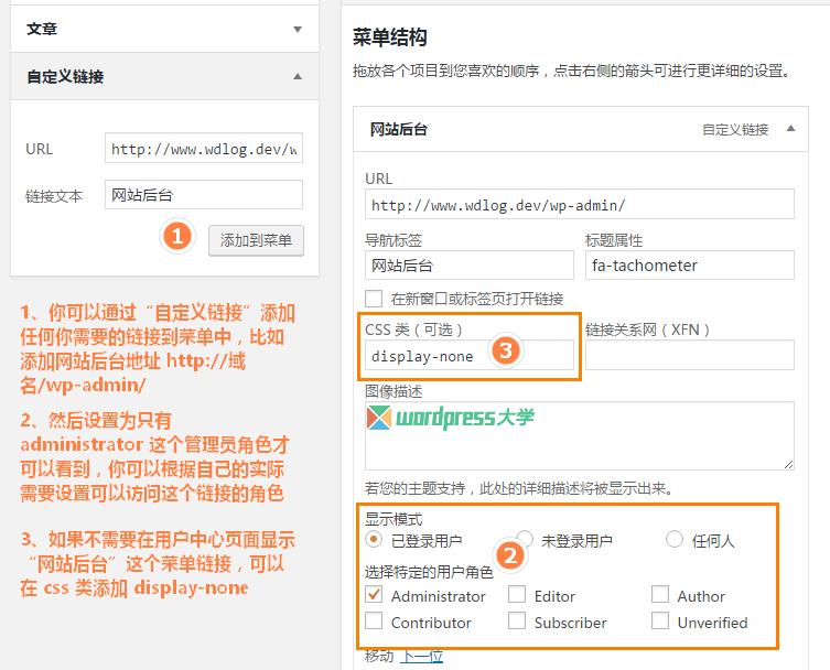 通過“自定義鏈接”添加,然后設(shè)置“顯示模式”為“已登錄用戶”,選擇“administrator”這個角色;如果不希望在用戶中心的頁面中顯示這個菜單,可以在“CSS類”添加“display-none”