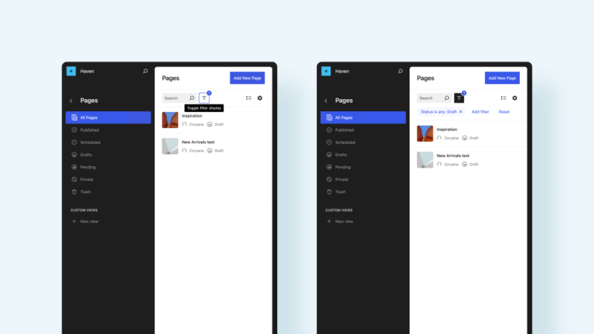 Gutenberg 19.0 包含 隱藏/顯示用戶界面中過濾器的功能。這簡化了數(shù)據(jù)視圖 UI,因?yàn)閺?fù)雜的過濾器(包括某些視圖的默認(rèn)過濾器)將不再占用 UI 空間。同時(shí),功能對等性和易用性得以保持,因?yàn)樵谛枰獣r(shí)仍可以通過單擊過濾按鈕來添加過濾器。