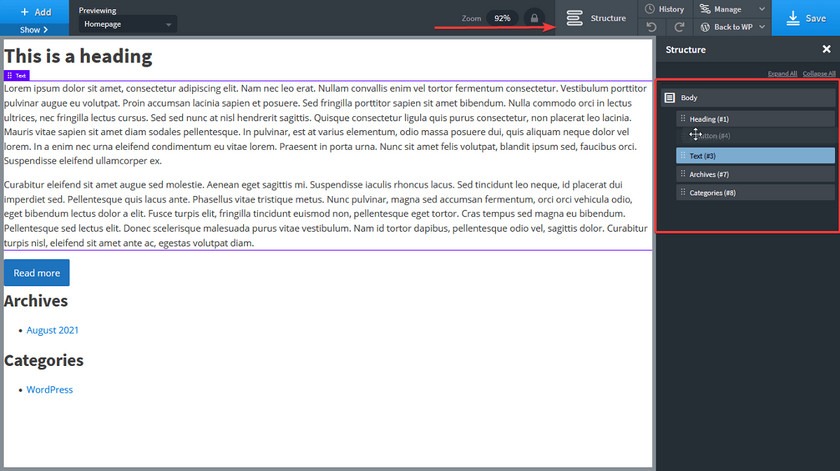 如果您想查看網(wǎng)站上的順序或排列元素,只需轉(zhuǎn)到Structure。您可以通過將元素拖放到此處而不是在預(yù)覽區(qū)域中來復(fù)制、刪除或移動元素。