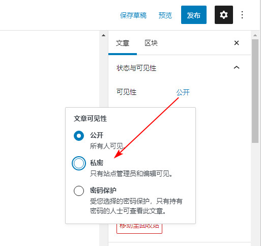 無論是您想要設為私有的頁面還是文章,您都可以在 WordPress 編輯器中進行操作。只需在右側邊欄中的“發(fā)布”部分下查找“可見性”功能,
