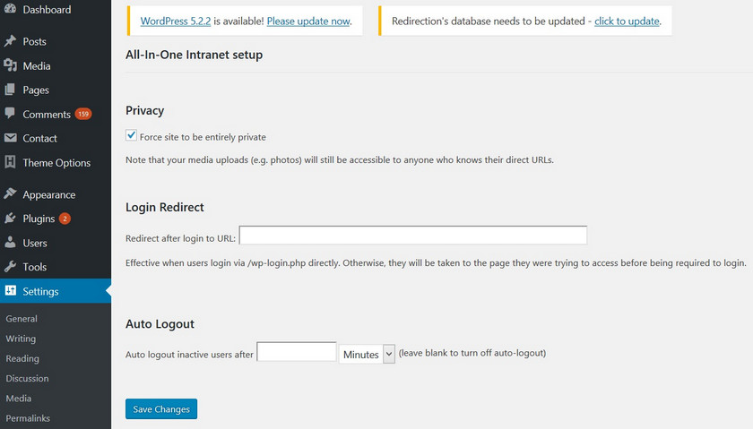 如您所見,只需處理一個復選框即可將您的整個 WordPress 站點設為私有,這真是太酷了!只有擁有登錄憑據(jù)的人才能看到您的網(wǎng)站。獎勵功能是登錄重定向設置,以及非活動用戶的自動注銷。