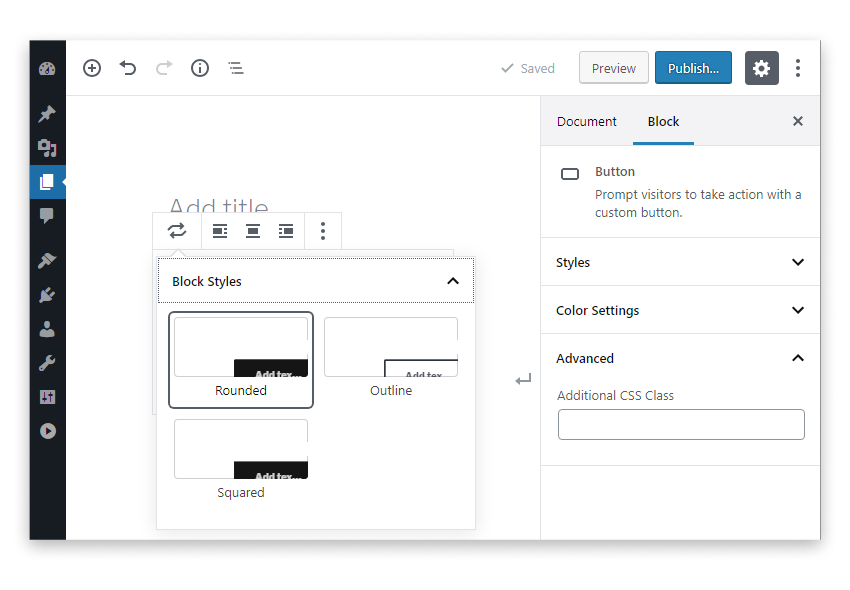 將新的按鈕塊插入編輯器并打開塊樣式變化選項。您應該會看到?默認情況下選中“?圓角”選項。如果在塊檢查器中打開“?高級”部分,會發(fā)現(xiàn)在文本字段中并沒有添加CSS類。因此,不會在塊標記中插入CSS類。查看編輯器中按鈕塊輸出的HTML以自行確認。