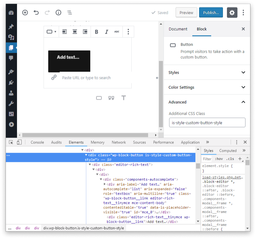 選擇后,塊樣式變體會?在塊檢查器面板中的is-style-custom-button-style“?附加CSS類”文本字段中添加CSS類。