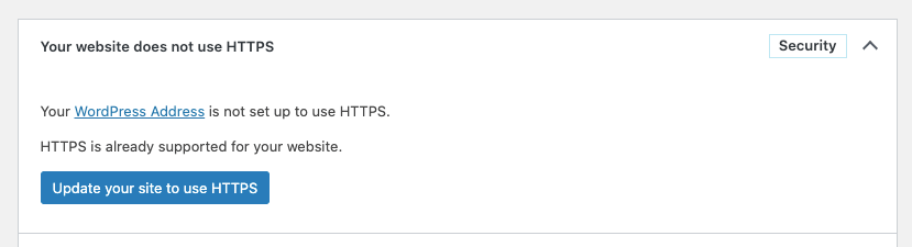 WP_UPDATE_HTTPS_URL環(huán)境變量或連接到新的wp_update_https_url?過濾器中來獲得。如果未提供此類URL,則默認(rèn)URL鏈接到此HTTPS支持文章。 - 提供實(shí)用程序以自動(dòng)將站點(diǎn)切換到HTTPS的主機(jī)可以通過設(shè)置