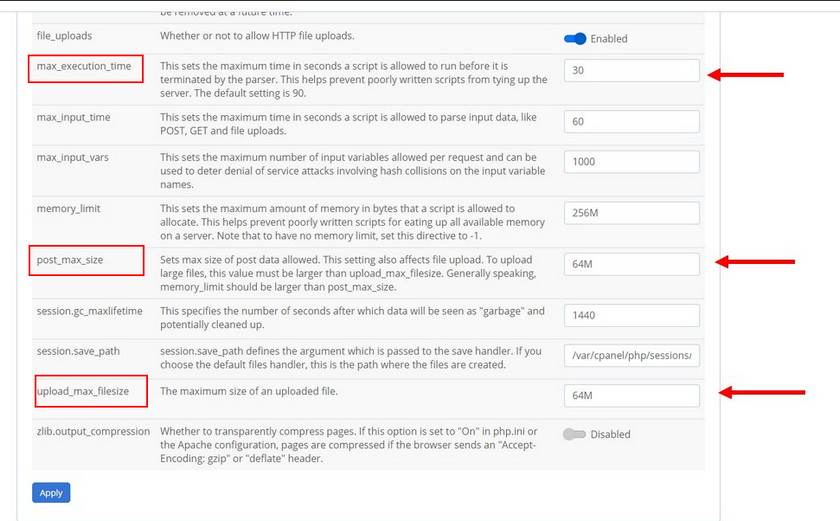 在PHP INI編輯器中,您將找到為您的帳戶設(shè)置的所有默認(rèn)參數(shù)。在編輯器中找到以下參數(shù):