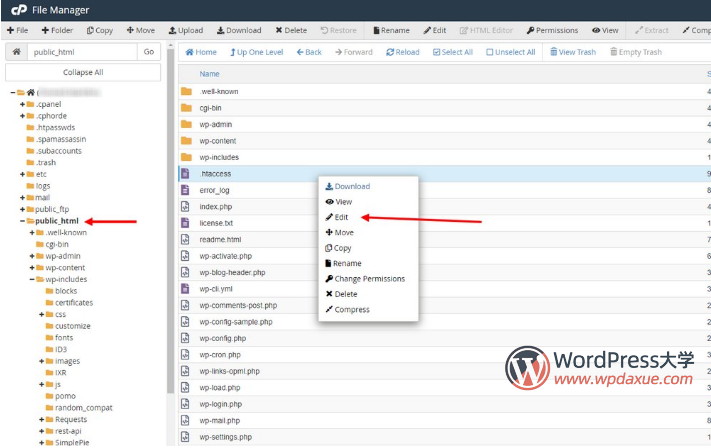 在此文件夾中,您將找到一個(gè)名為.htaccess的文件。右鍵單擊該文件,然后選擇“ 編輯”以自定義文件。
