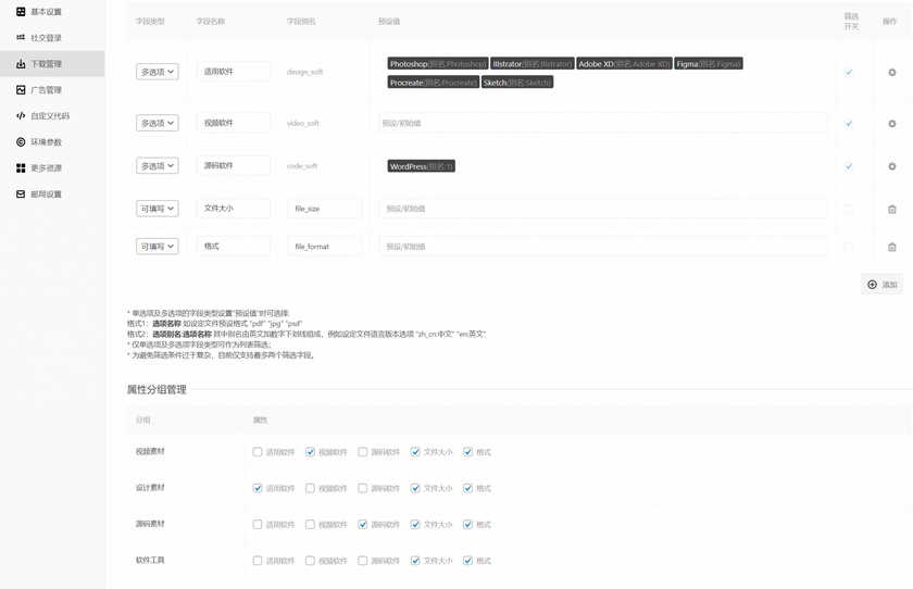 注:Triple主題支持多組資源屬性配置,以實現(xiàn)不同類型的資源屬性設置,并且提供一組可配置圖標的預設字段,以實現(xiàn)資源列表篩選支持。