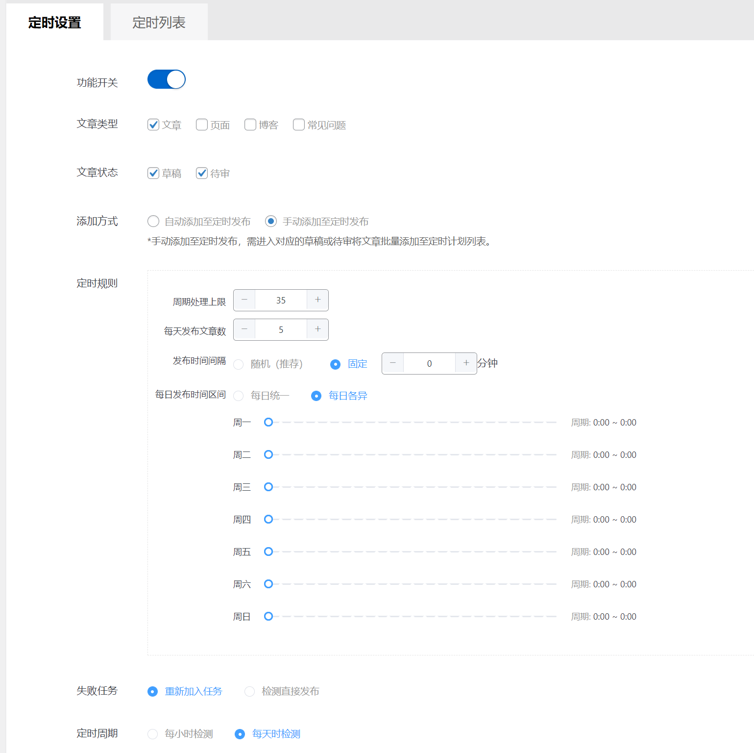 - 定時設(shè)置-支持將不同文章類型的草稿或者待審內(nèi)容添加至定時發(fā)布清單,按所設(shè)定的定時規(guī)則自動發(fā)布;