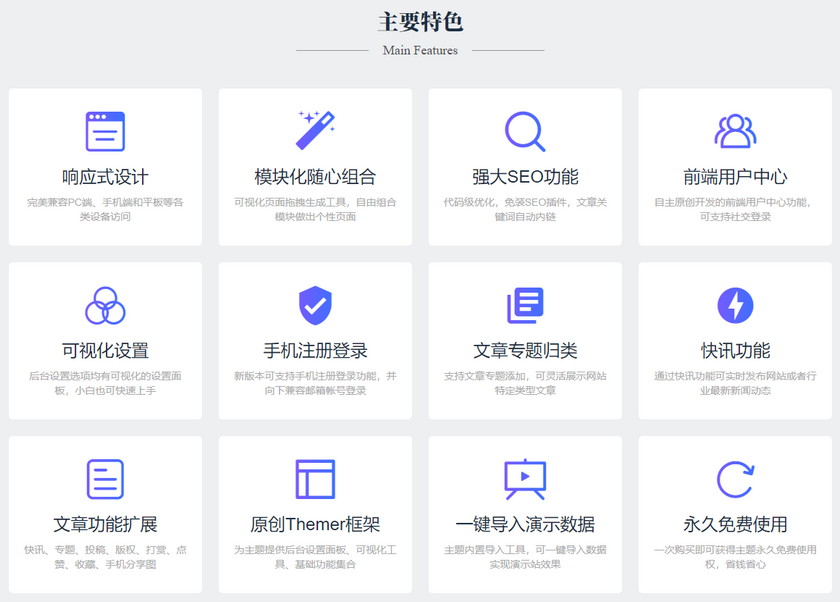 - 自主開發(fā)Themer框架,支持后臺自定義面板設置;