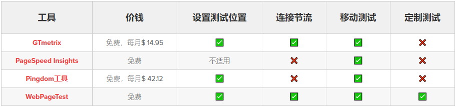 首先,我們通過(guò)下面的表格簡(jiǎn)單看下GTmetrix、PageSpeed Insights、Pingdom Tools和WebPageTest的基本差異: