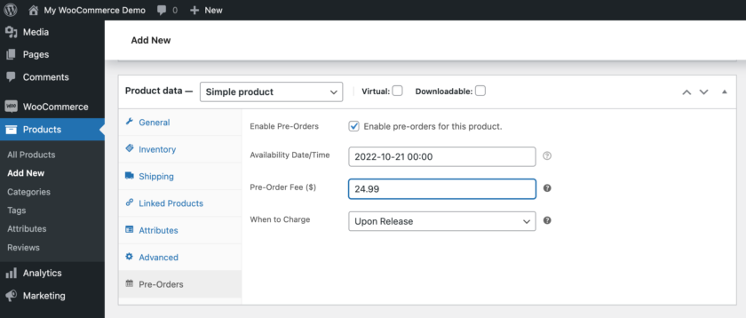 在對(duì)該功能的測(cè)試中,我選擇了 WooCommerce Pre-Orders 擴(kuò)展。登錄后,該站點(diǎn)在幾秒鐘內(nèi)加載完畢,擴(kuò)展程序已在空商店中激活。我成功地創(chuàng)建了一個(gè)可供預(yù)訂的產(chǎn)品。