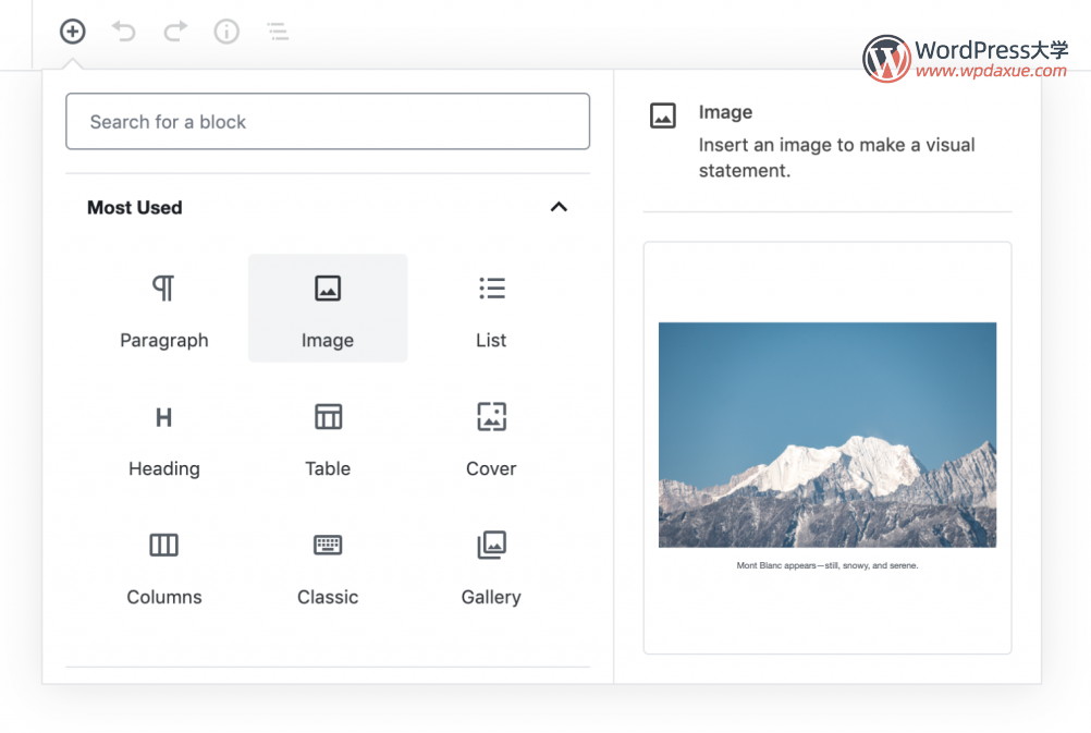 WordPress 5.3 還新增了在插入庫之前預覽庫中塊的功能。這可以幫助用戶一目了然地確定要插入的塊。