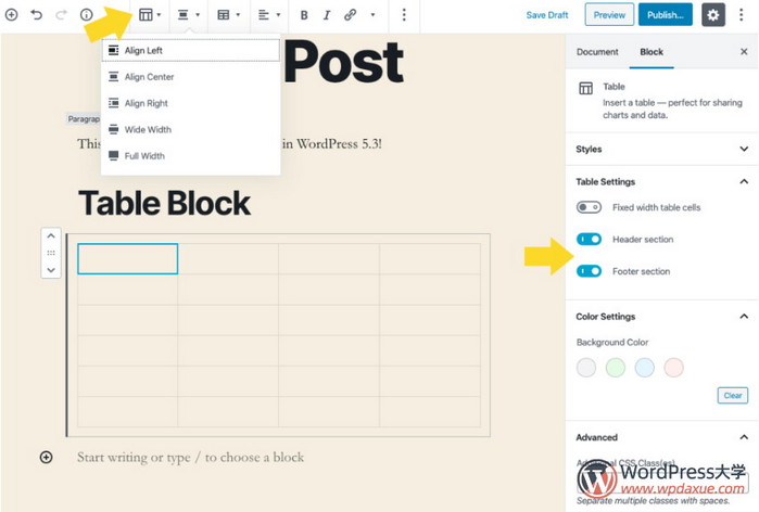 現(xiàn)在,表格塊支持頁眉和頁腳行,可從“塊設(shè)置”中獲得。表格對齊還有一個新選項,而不僅僅是文本對齊。