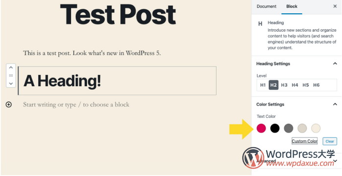 WordPress 5.3現(xiàn)在提供了文本和背景顏色的控件。默認(rèn)顏色可能由您的主題決定(如此處所示,如“2020”)。您也可以將“自定義顏色”鏈接用于顏色選擇器。