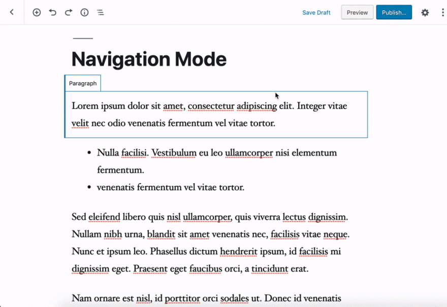 為提高屏幕閱讀器的可訪問性,WordPress 5.3中的塊編輯器引入了新的導(dǎo)航模式。現(xiàn)在,您可以使用Tab鍵在一個塊之間移動 。您也可以使用箭頭鍵在塊之間導(dǎo)航。到達要編輯的塊后,您可以通過按Enter 鍵進入編輯模式 。使用Esc鍵返回到導(dǎo)航模式。