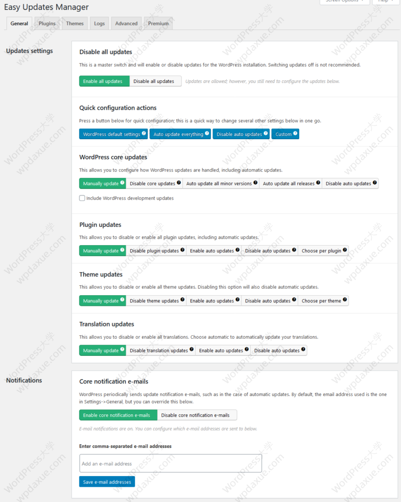 要使用Easy Updates Manager插件啟用自動更新,請轉(zhuǎn)到儀表板>更新選項(xiàng),然后啟用“啟用所有更新”選項(xiàng)。然后,您可以分別配置主題、插件和核心更新。?