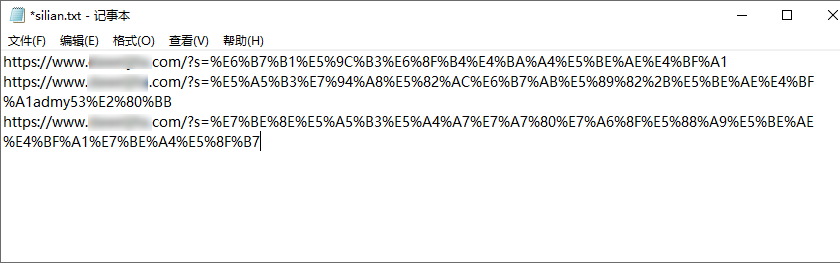 創(chuàng)建一個名為 silian.txt 的文件,然后訪問上面的惡意網(wǎng)址,將網(wǎng)址復制到 silian.txt 中,每行一個: