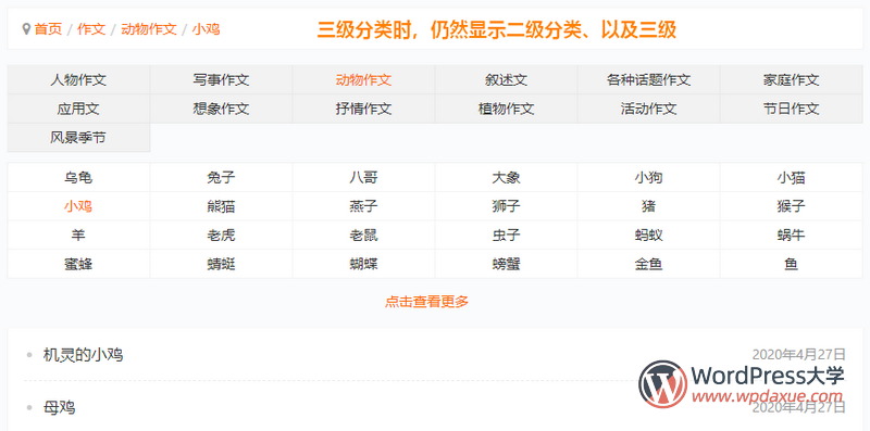 當訪問三級分類,【作文】-【動物作文】-【小雞】時,顯示的分類列表和上面一樣,只不過將【動物作文】和【小雞】高亮顯示: