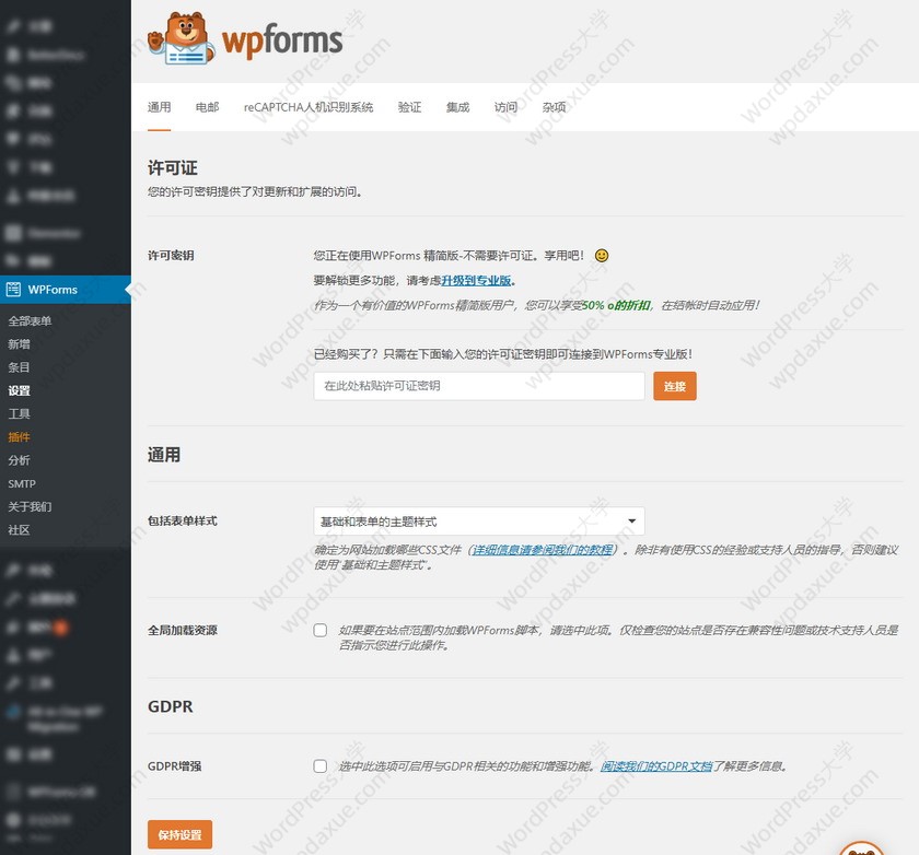 WPForms 表單插件的設(shè)置界面比較簡單,可以對插件功能進(jìn)行一些設(shè)置。