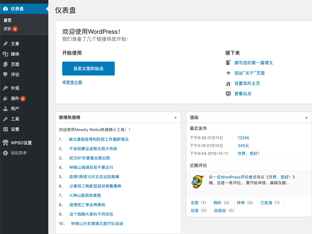 2020年春節(jié)前后,疫情不斷加重,每天都要刷微博,查看最新的動(dòng)態(tài),能不能一進(jìn)入WordPress的儀表盤就能看到最新的消息呢?答案是肯定的,在本文文末下載WordPress儀表盤微博熱搜小工具就好,默認(rèn)顯示10條,如果想自己修改數(shù)量,只需要將里面的數(shù)字9修改成自己需要的數(shù)字減1就好,最終顯示效果如下: