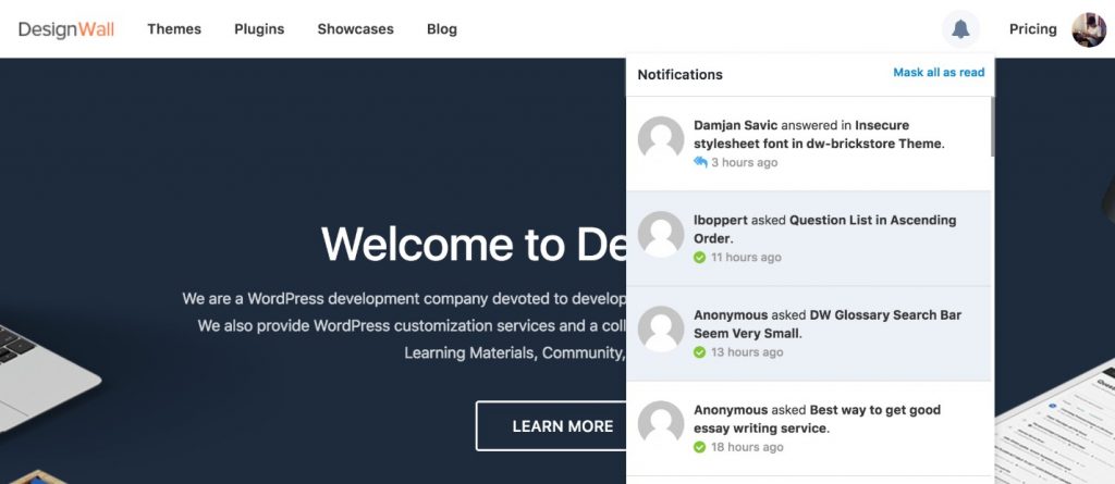 如果想給網(wǎng)站添加一個(gè)通知功能,用來發(fā)布網(wǎng)站公告和網(wǎng)站動(dòng)態(tài),可以試試?DW Notifications 插件。通過簡碼直接添加到導(dǎo)航菜單中,就可以出現(xiàn)類似下面的界面,可以獲取網(wǎng)站的一些動(dòng)態(tài)以及發(fā)布自定義通知等,看起來還不錯(cuò)!