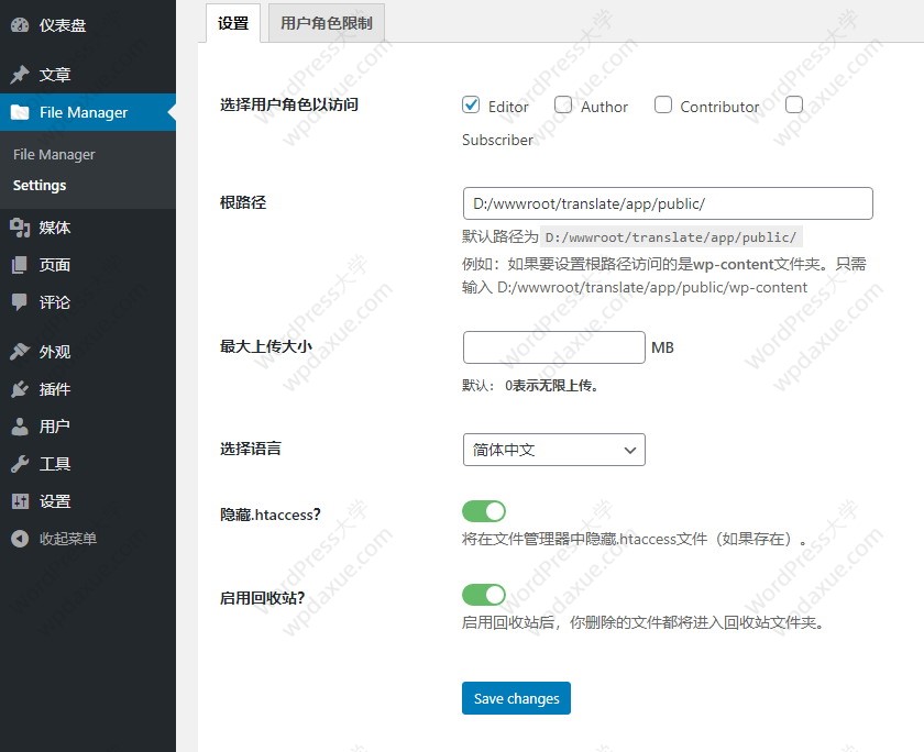- 用戶權(quán)限設(shè)置:要上傳的文件擴展名,文件可見性,根路徑訪問