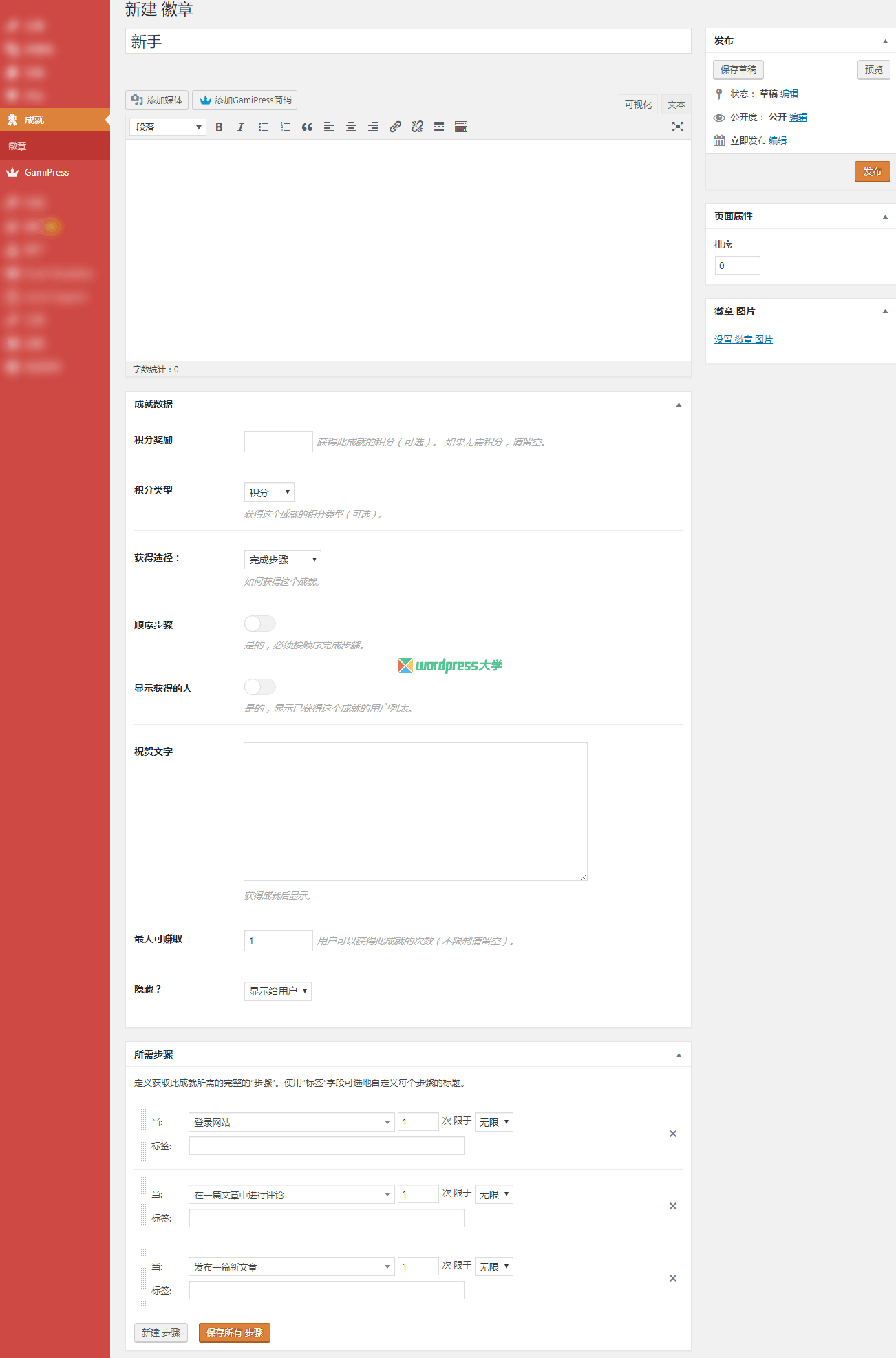 如果大家比較感興趣就自己安裝測(cè)試下吧。在后臺(tái)插件安裝界面搜索? GamiPress 在線安裝即可,或者在這里下載后手動(dòng)安裝。倡萌已漢化該插件,需要的就點(diǎn)擊下載簡(jiǎn)體中文包,解壓后將里面的語(yǔ)言包文件上傳到該插件的?languages 目錄即可。