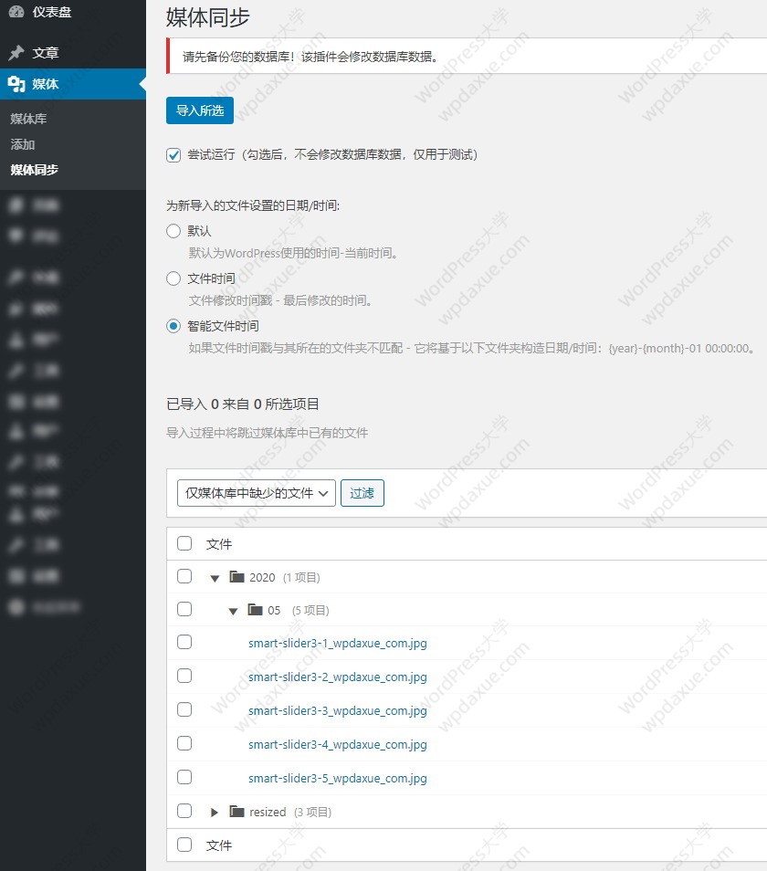 插件使用和簡單,安裝并激活插件以后,就可以在【媒體】菜單下找到“媒體同步”,點擊圖中的“掃描文件”按鈕: