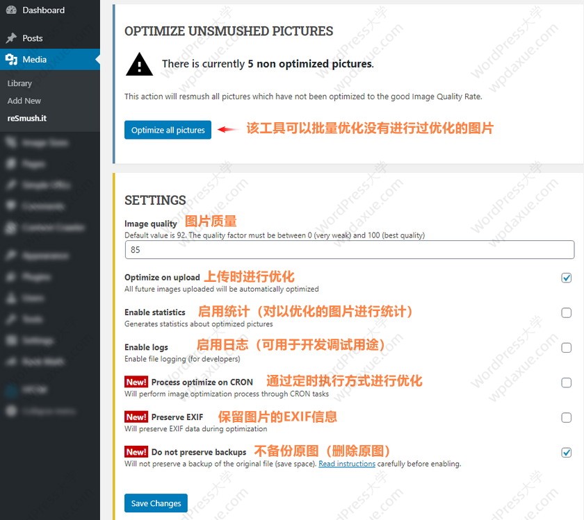 安裝啟用插件以后,你可以在 媒體 – reSmush.it 進(jìn)入到插件的設(shè)置界面,如下圖所示: