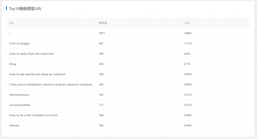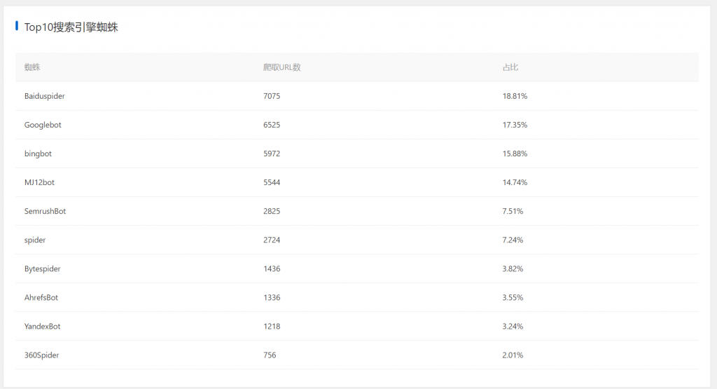 支持按今天、昨天、最近7天及最近30天查看Top10蜘蛛爬取URL的爬取次數(shù)及占比,方便站長對熱門蜘蛛爬取頁面URL進行分析。
