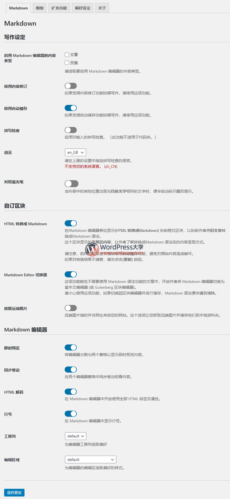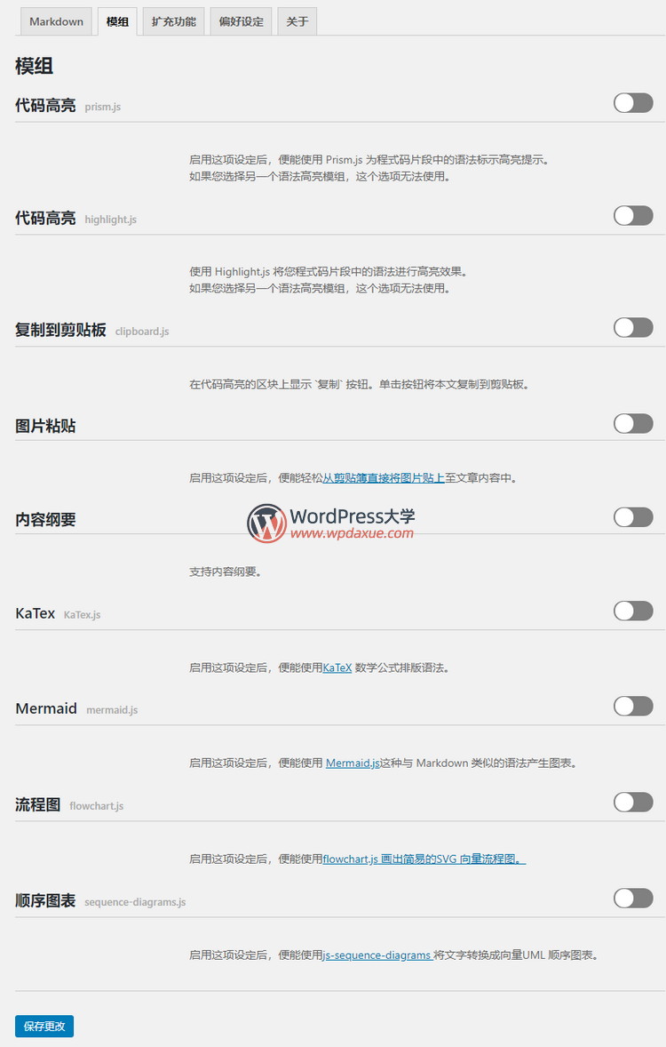WP Githuber MD 兼容經(jīng)典編輯器和Gutenberg編輯器,可以為單個(gè)文章啟用/禁用Markdown,支持自定義文章類型,支持代碼語法高亮、流程圖、甘特圖、KaTex、數(shù)學(xué)公式渲染、 順序圖等等。