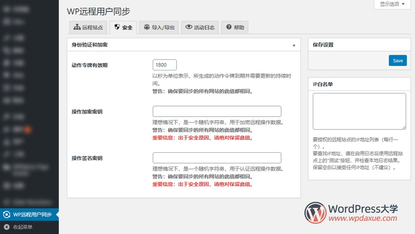 - WP Remote Users Sync管理員頁面:用于管理遠(yuǎn)程站點(diǎn),安全設(shè)置,導(dǎo)入/導(dǎo)出用戶以及查看活動(dòng)日志。
