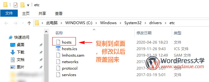 在資源管理器中訪問 C:\Windows\System32\drivers\etc,就可以看到 hosts 文件: